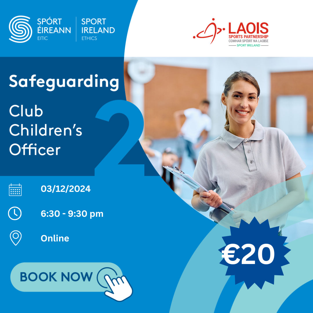 Laois Sports Partnership: Safeguarding 2 - A person appointed to the Club Children’s Officer Position in a club must have completed Safeguarding 1 (Child Welfare & Protection Basic Awareness workshop) and should complete the NEW Club Children’s Officer 3 hour workshop.