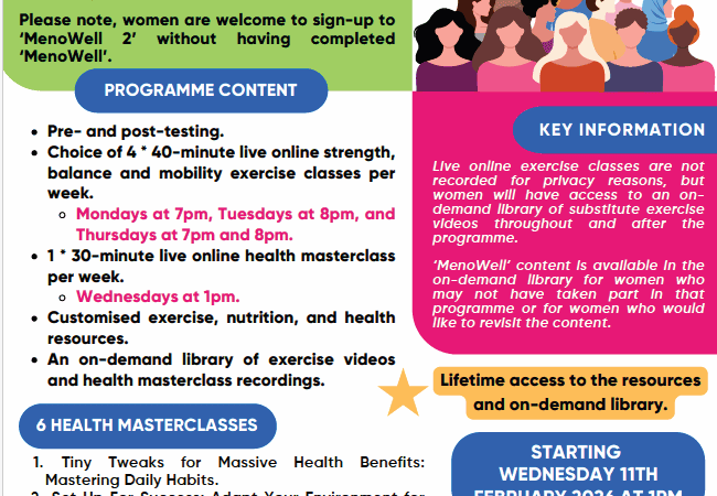 ‘MenoWell 2 Laois’ is a FREE 6-week online expert-led and evidence-based women-specific exercise and lifestyle medicine programme to help women thrive in midlife and beyond. What does it involve? The