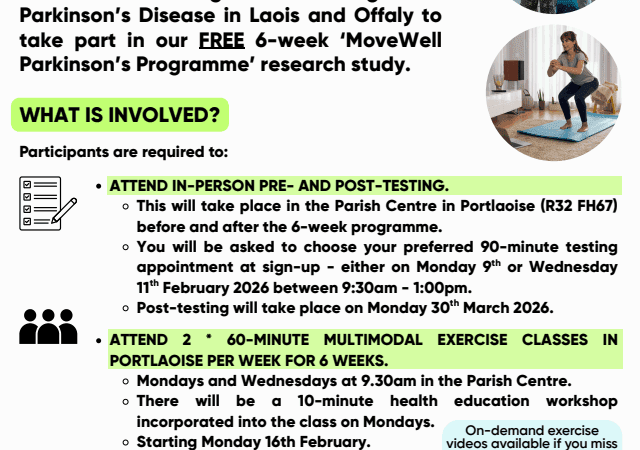 Edufit, in partnership with Laois Sports Partnership are recruiting adults living with Parkinson’s Disease in Laois and Offaly to take part in a free 6-week