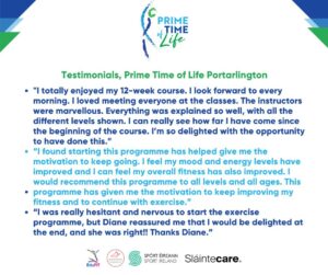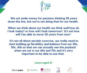 ‘Prime Time of Life’ is a 12-week online health education & multimodal exercise programme for adults aged 40-85 years. In partnership with Edufit, we designed, implemented, and evaluated our initial evidence-based Sláintecare funded ‘Prime Time of Life programme’ in 2020.