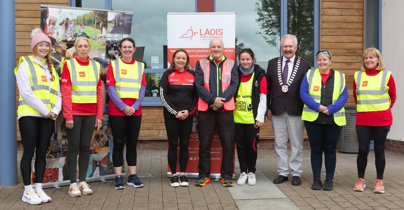 Group of people wearing high-vis jackets standing with Mayor next to Laois Sports signage.