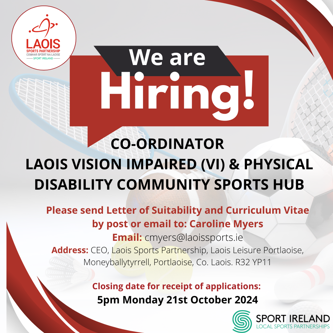 Laois Sports Partnership CLG wishes to recruit a CO-ORDINATOR for LAOIS VISION IMPAIRED (VI) & PHYSICAL DISABILITY COMMUNITY SPORTS HUB. This is an exciting opportunity to join a local Sports Partnership and really engage with the community.